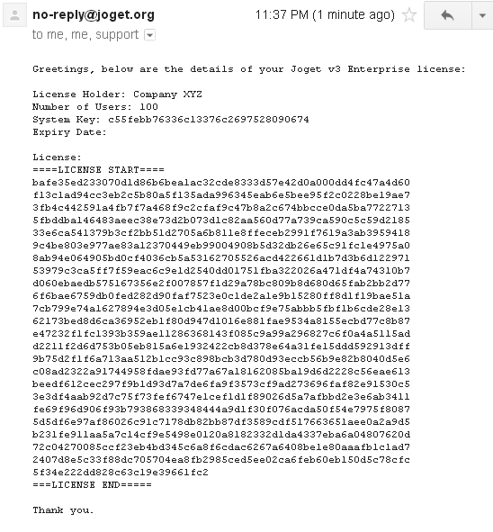 - After you have submitted your "Request for Enterprise License" form, if approved (usually not more than 24 hours), you will receive an email with the "License" key.
