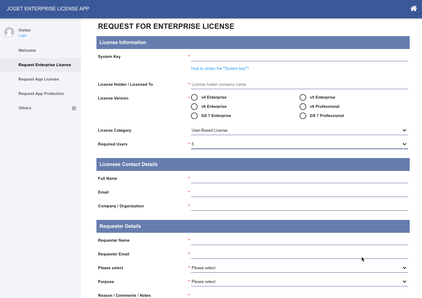 - Select Request for Enterprise License from the menu to access the license request form. Refer to the following screenshot.
