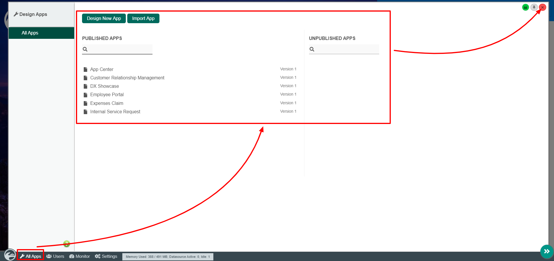 You will also find options for you to design a new app or to import App created from elsewhere too.To close the overlay window, click on the large red X button on the top right. (see Figure 3)
