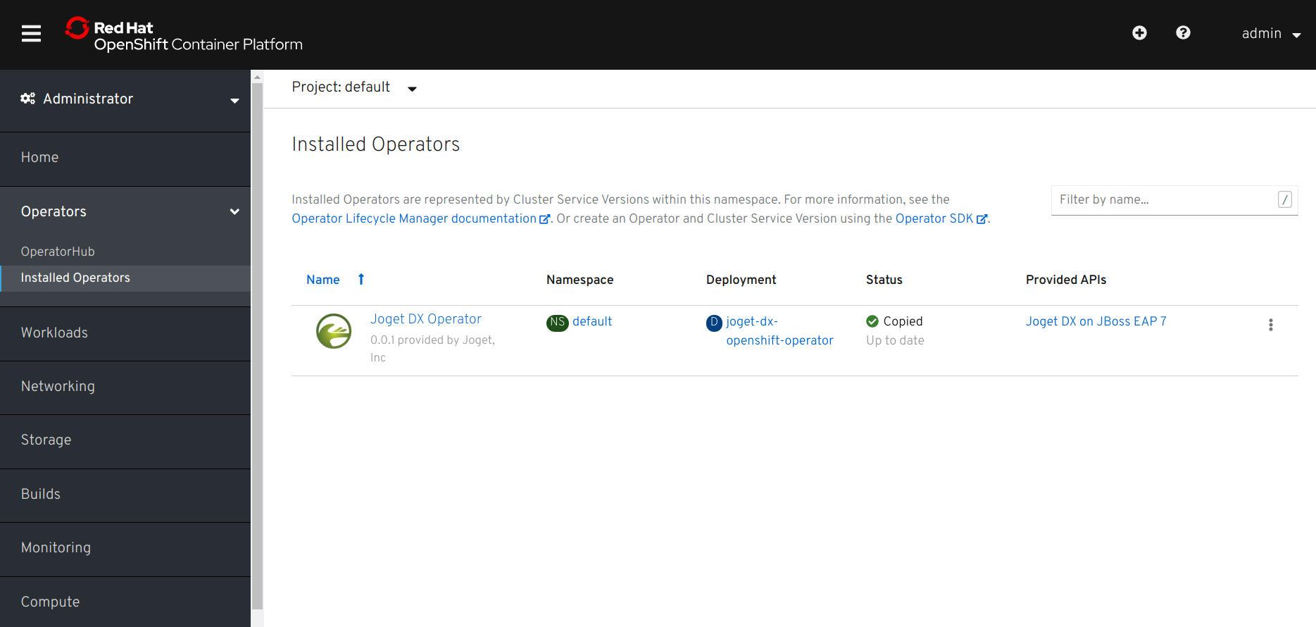 5. Browse to Catalog > Installed Operators and select Joget DX Operator to confirm that the operator has been installed successfully.