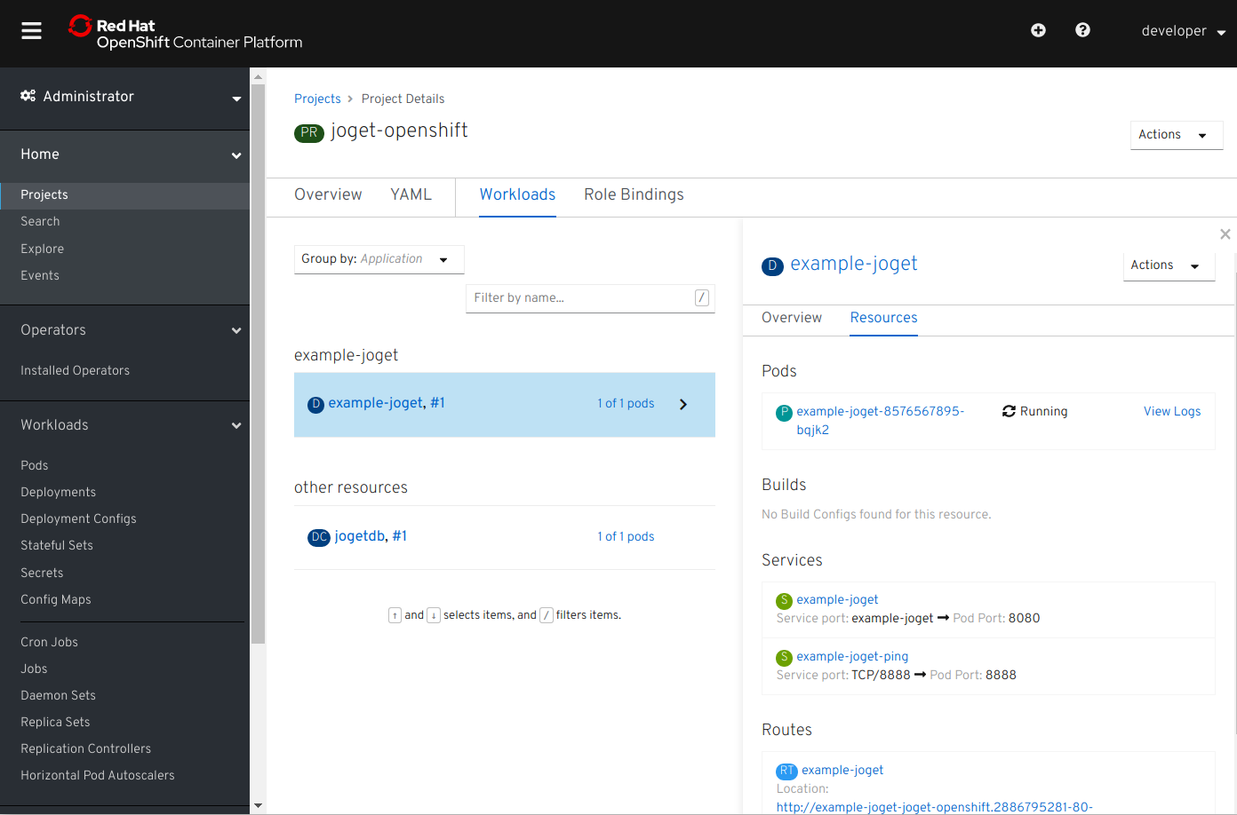 2. Select Resources to see the created Services and Routes. Copy the Location in the created Route. That is the URL to access Joget DX from an external browser.
