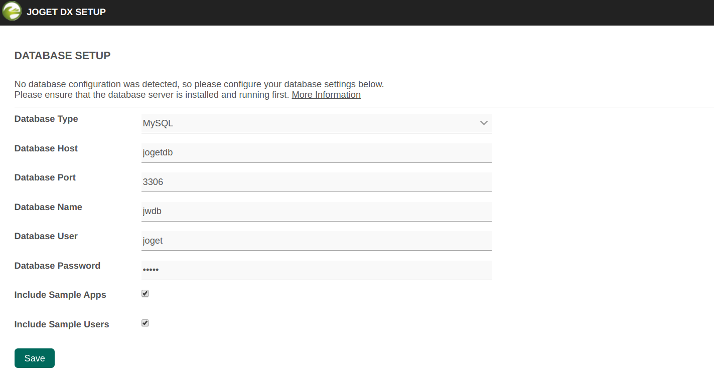 3. Access the Joget DX URL and in the Database Setup page, key in the database configuration of the database deployed earlier and click on the Save button.