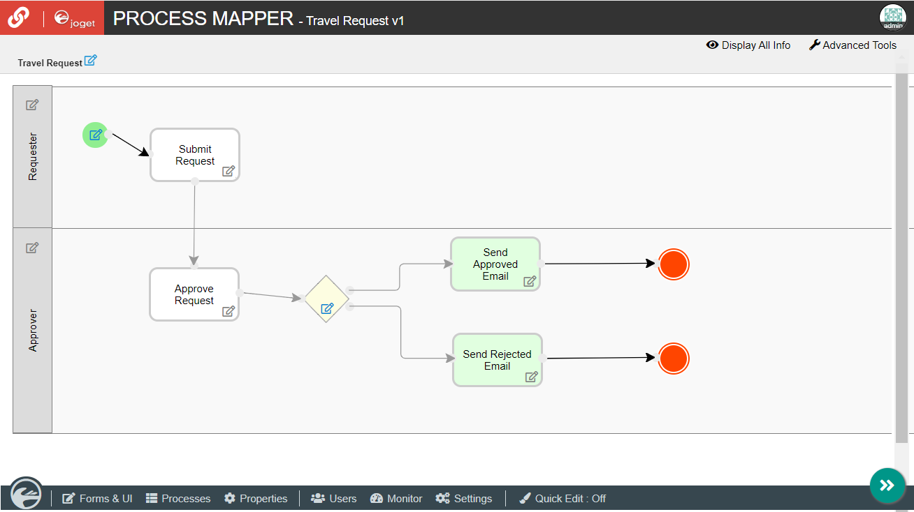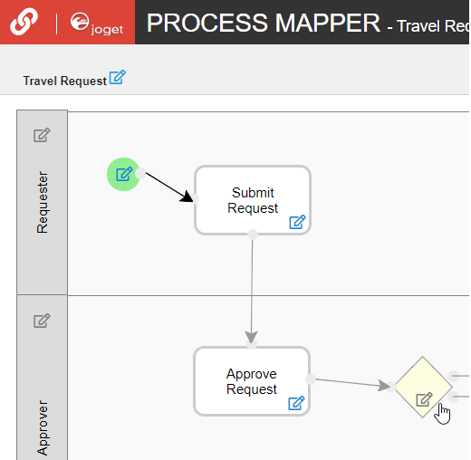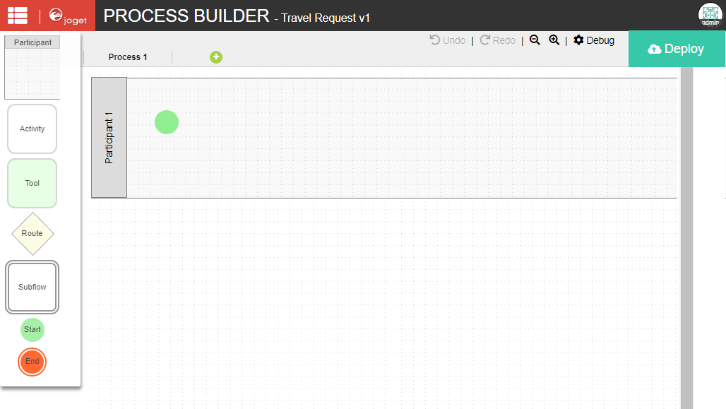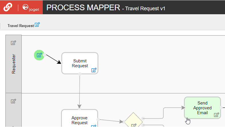 Once a process has been successfully deployed, return to the previous tab/window. The new process diagram will be generated after you click on OK. Joget will interpret the process diagram and load the process details.