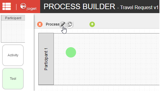 Add Participants into the process by clicking on the green add button under current Participant. Participants represent users or roles that perform a certain task. Click on the edit button while hovering over the participant name to set its properties.