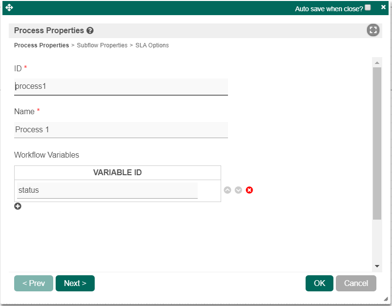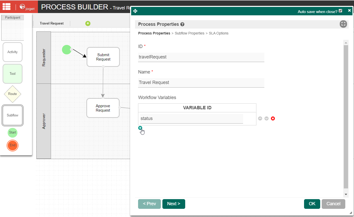 To handle routing (for example approval conditions), use Routes in combination with workflow variables. To create a workflow variable, click on Design Process to access the Process Builder. Double click on the process name in the Navigator to bring up the process dialog. Click on the first small icon under the Workflow variable heading, and key in the ID of the variable e.g. status.