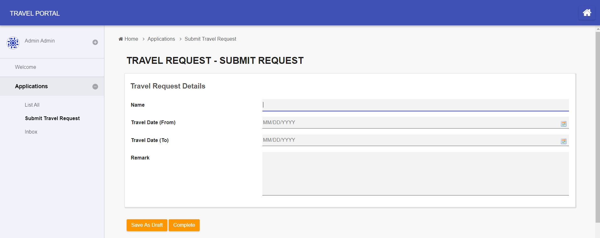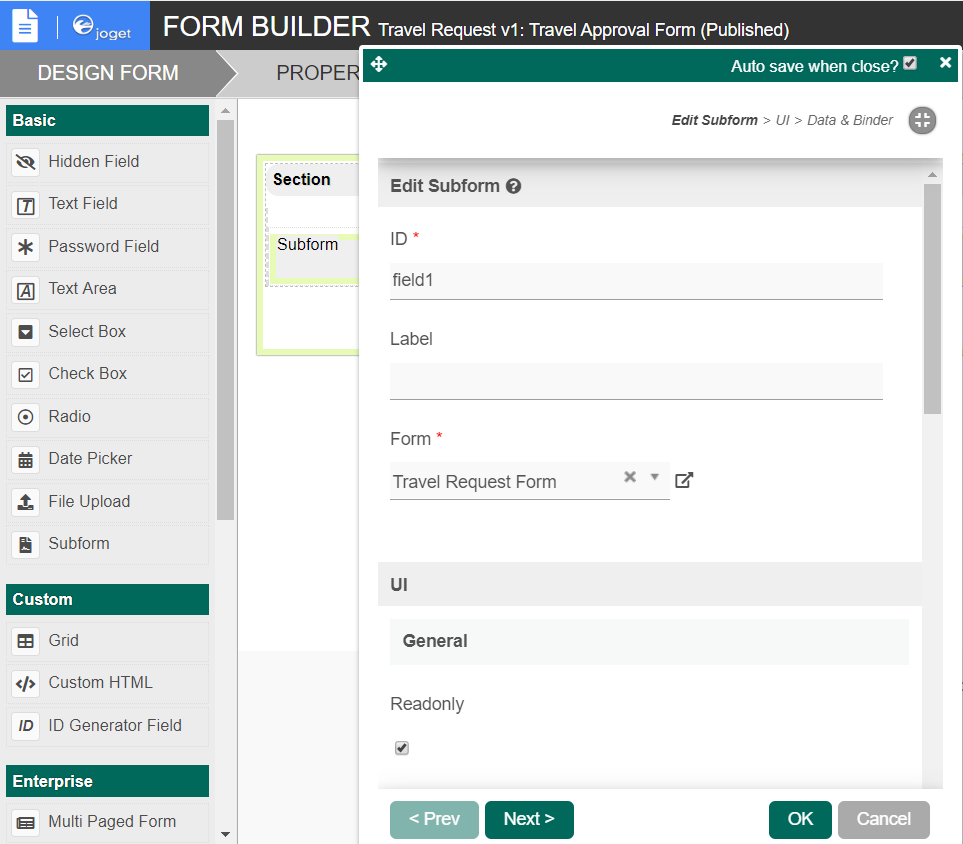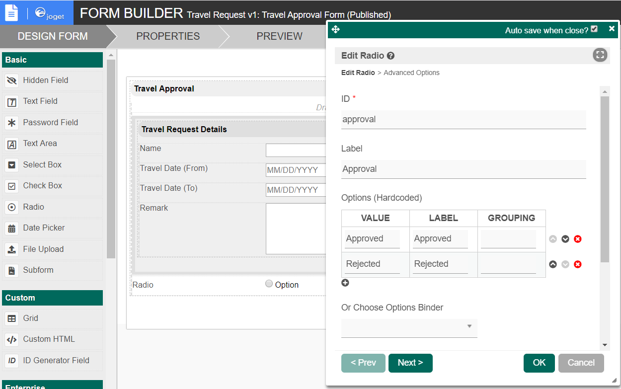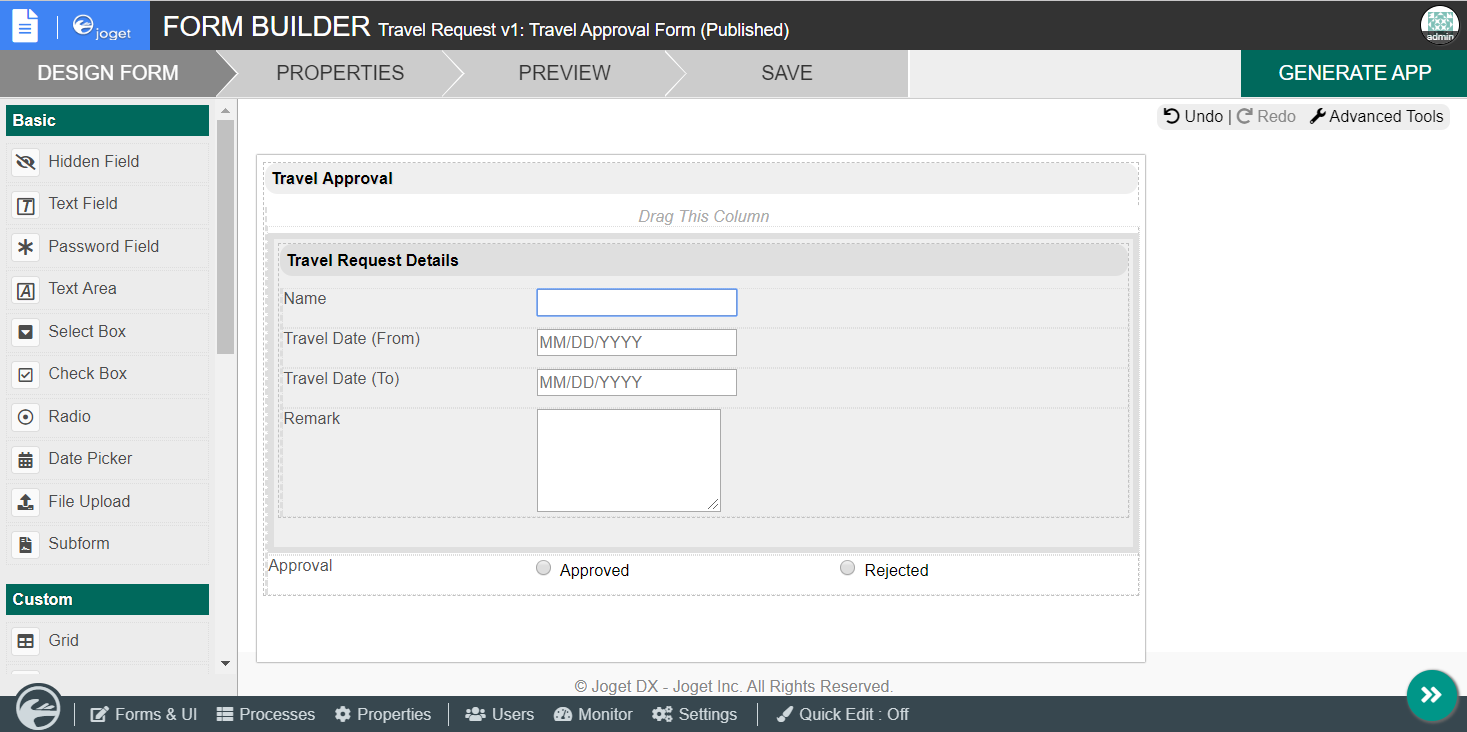 As an example to handle an approval process, click on Create New Form to create a new Travel Approval Form. In this new form, add a Subform that displays the original submitted form, and radio buttons to capture the approval status.
