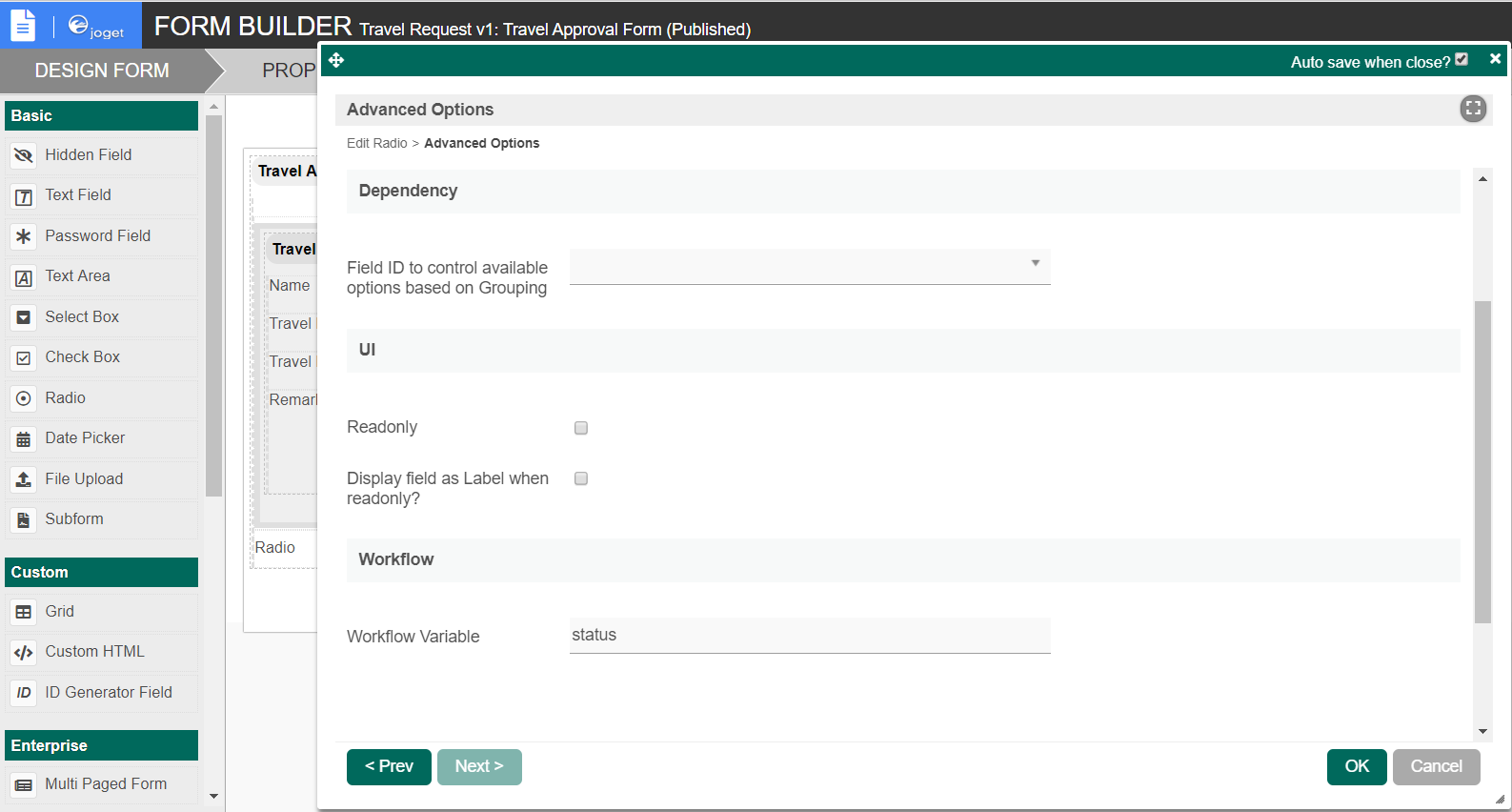 For routing purposes, an important setting in the radio button is the mapping to a workflow variable under Advanced Options. In this case, setting the mapping to status means that the value will be stored in the status workflow variable.