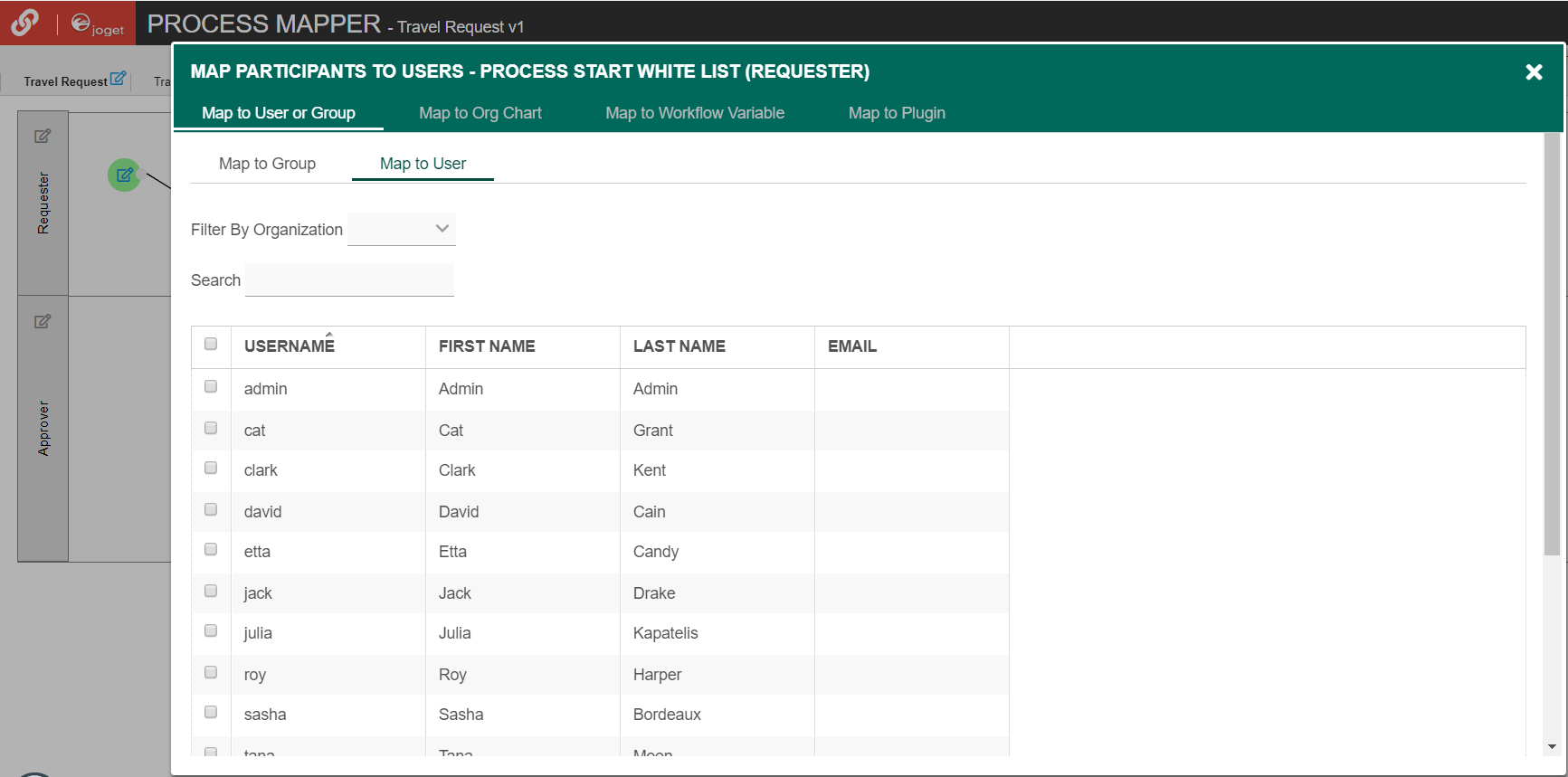 Participants defined in the process are listed in the Map Participants to Users, and you can map each participant to specific people. Click on Add/Edit Mapping to map to specific groups, users, organization chart, etc. If no mapping is done for a participant, any tasks are automatically defaulted to the current user instead.