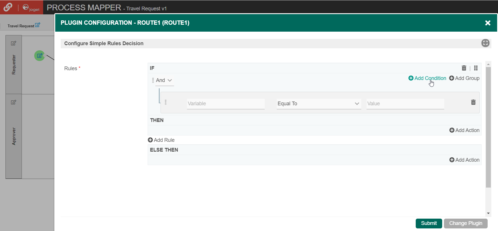 In the plugin configuration,click on Add Rule and then click Add Condition. Set the Variable field to status and set the Value field to Approved. The variable status is referring to the workflow variable.