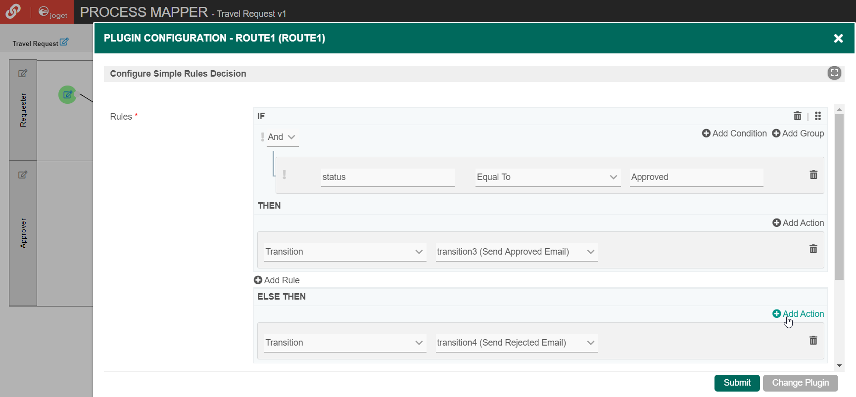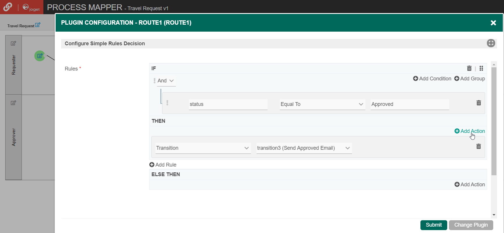 In the THEN rule, click on Add Action and set Type to Transition and set Transition to transition3 (Send Approved Email). This means that this transition will occur if the value of status is "Approved".
