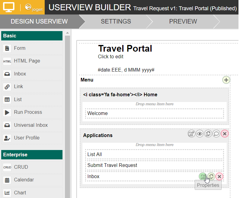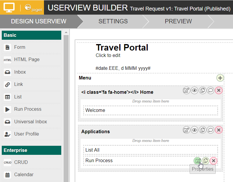 In the Design App page, click on the name of an existing userview to launch the Userview Builder.