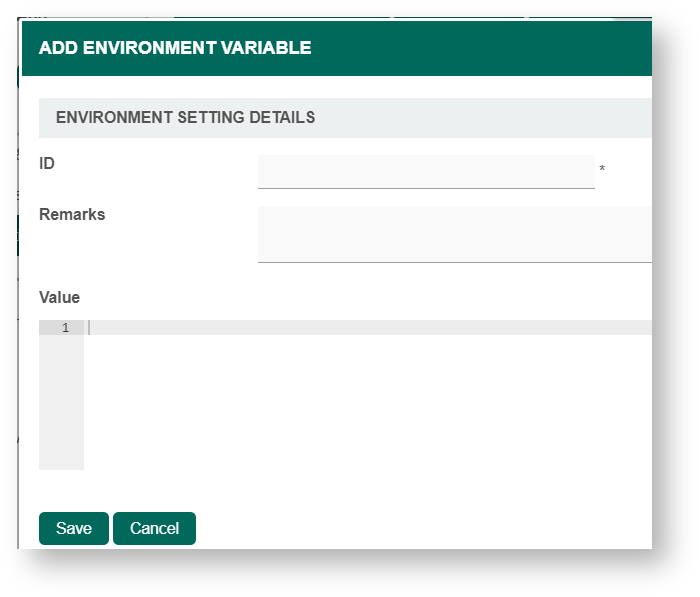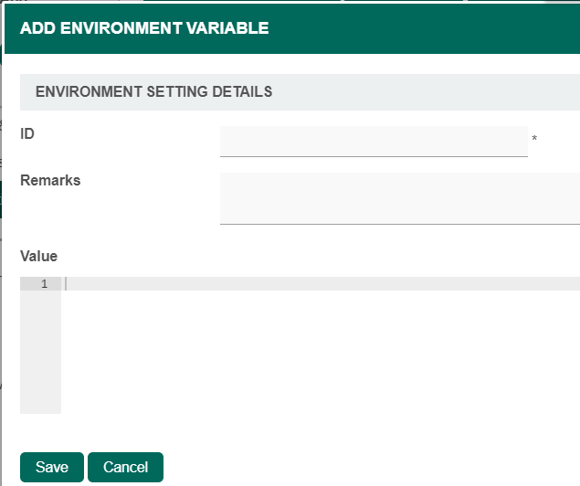 | ID | Env variable id. Only letters (a-z and A-Z), numbers (0-9) and underscore (_) are allowed in the ID field. ID cannot have space. Mandatory field. |