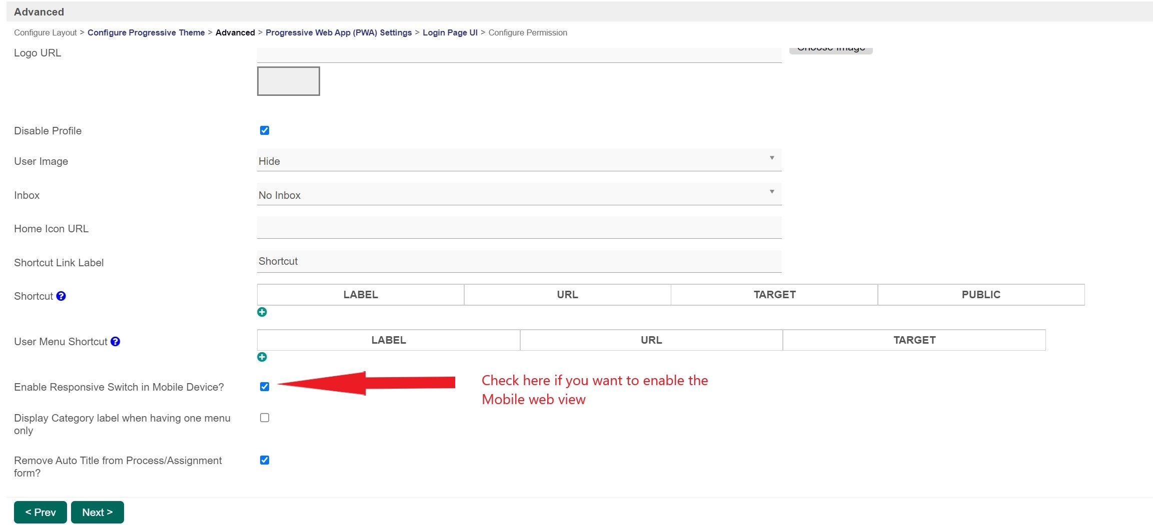Mobile view for your apps are enabled by default. An app can have multiple Userviews. To disable the mobile web view for a Userview, go to your app "Userview" and under "Settings", check the "Mobile View Disabled" property.