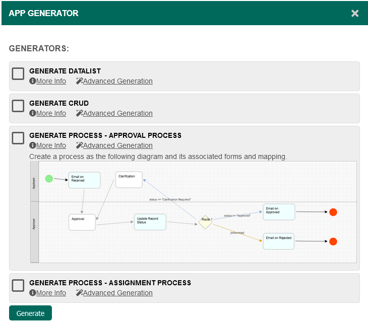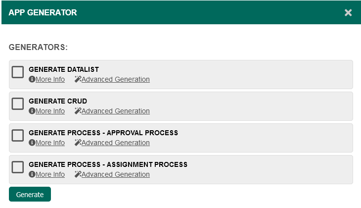 App Generator allows you to generate lists, CRUD (Create-Read-Update-Delete), processes directly from a form.