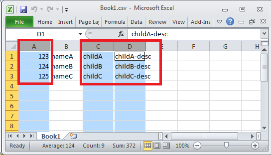 Figure 9: Source data highlighting data that will be imported into the target form's subform's database table (child)