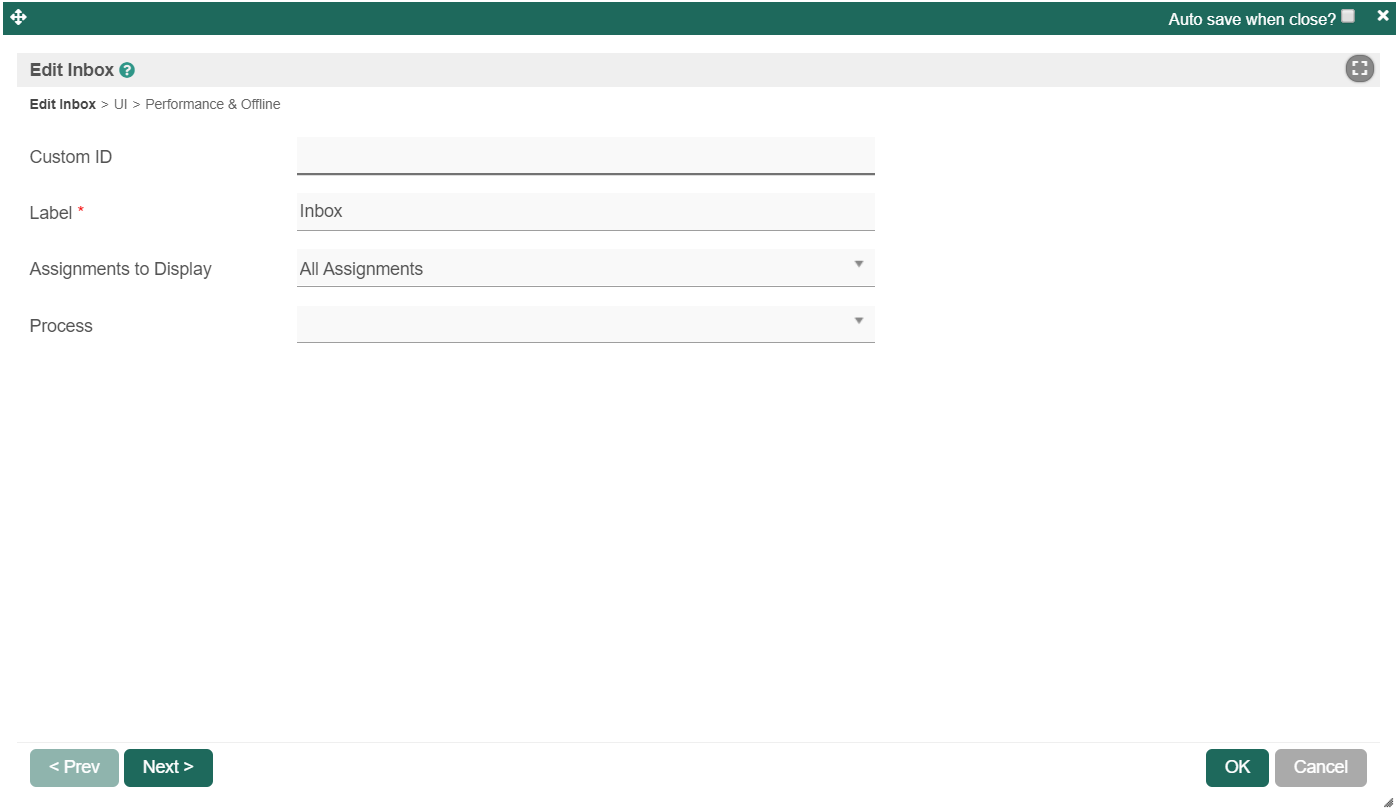 Process | Filter current user tasks by a specific process. Required when Assignments to Display is set to "Assignments for a Process only". |