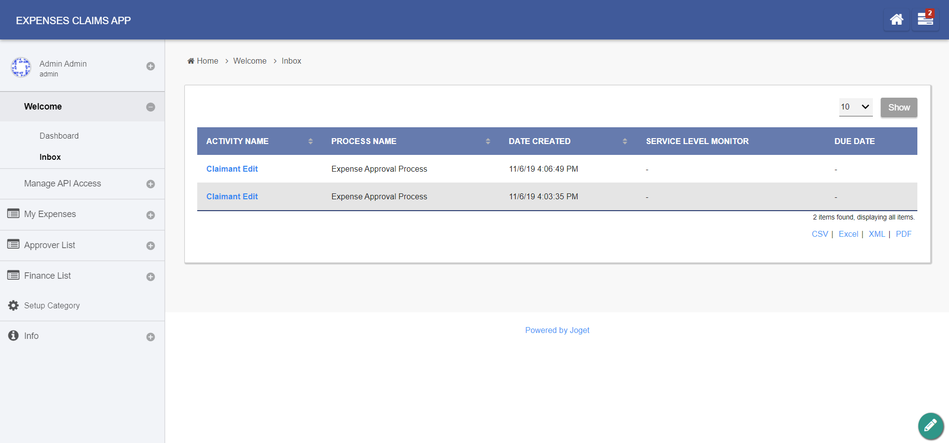 Figure 2: Sample Inbox Menu in runtime