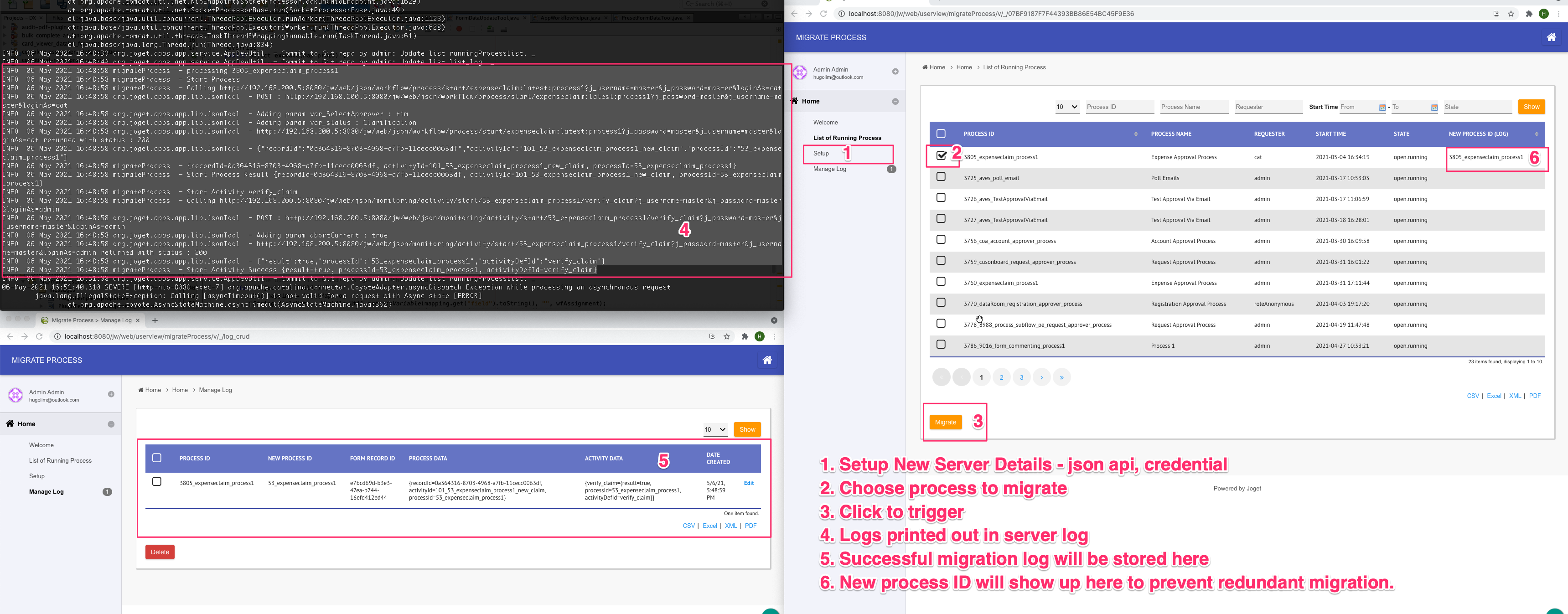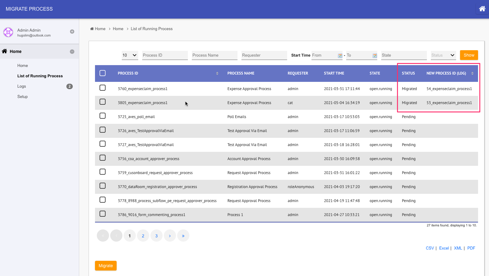In the List of Running Process menu, the status will change to "Migrated" with process instance ID furnished based on the data from logs.