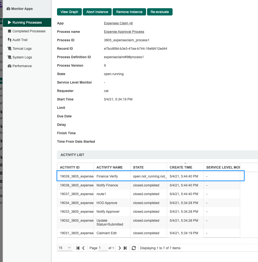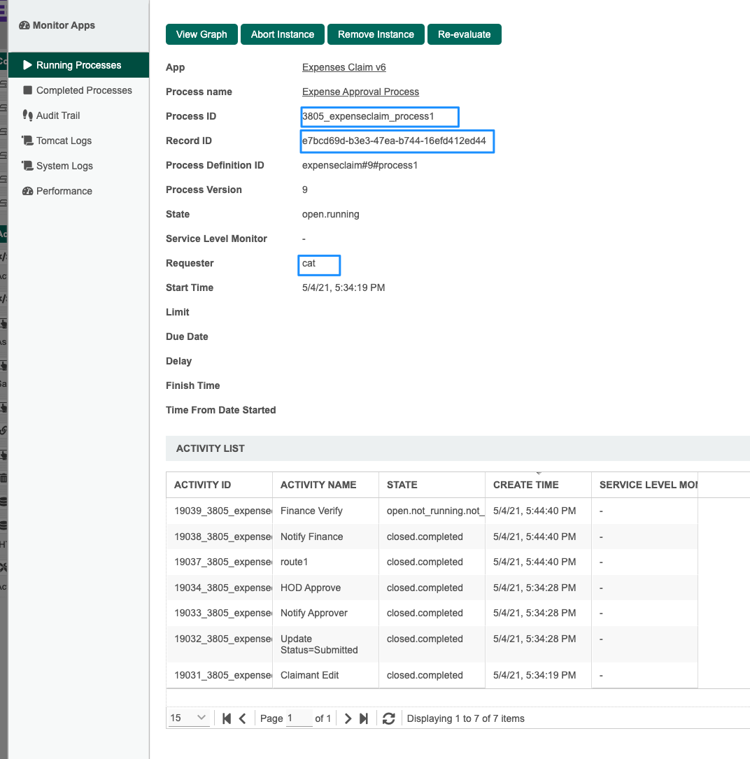 - Based on the list compiled in step 1, start new process instance in the new server using the same user with reference to the form record ID. Here's a sample of a process instance that is still running.