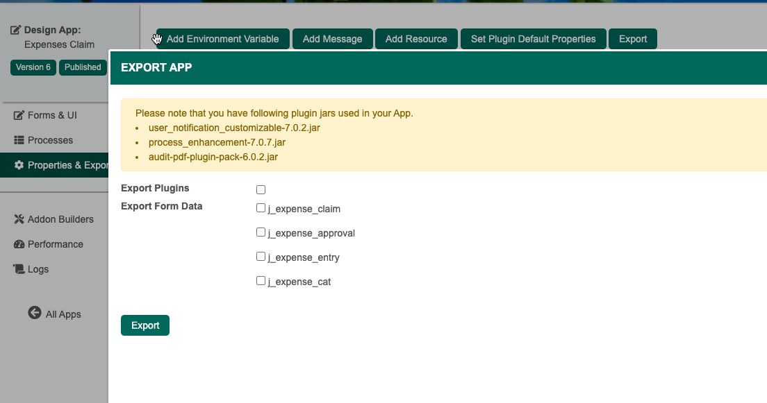 When exporting app, we can export its dependant plugins as well as form data too. By default, only the app design is exported out.