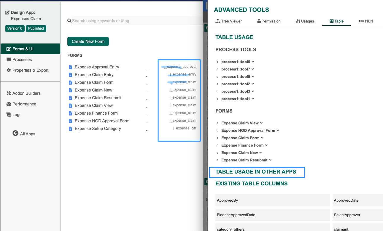 Referring to Figure 1 above, we can make use of the Form builder > Advanced Tools > Table > Table Usage In Other Apps to check if tables are being shared with other apps.