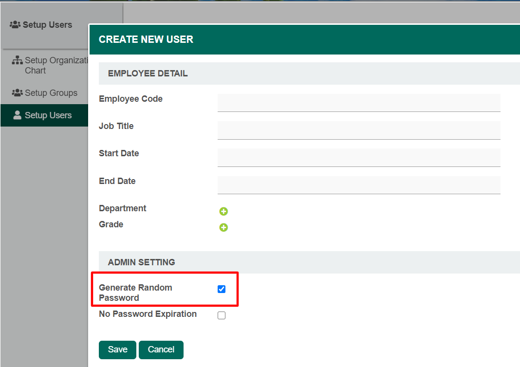 3. Admin also has an option to check "No password Expiration" in case he/she doesn't want their user's password to expire.