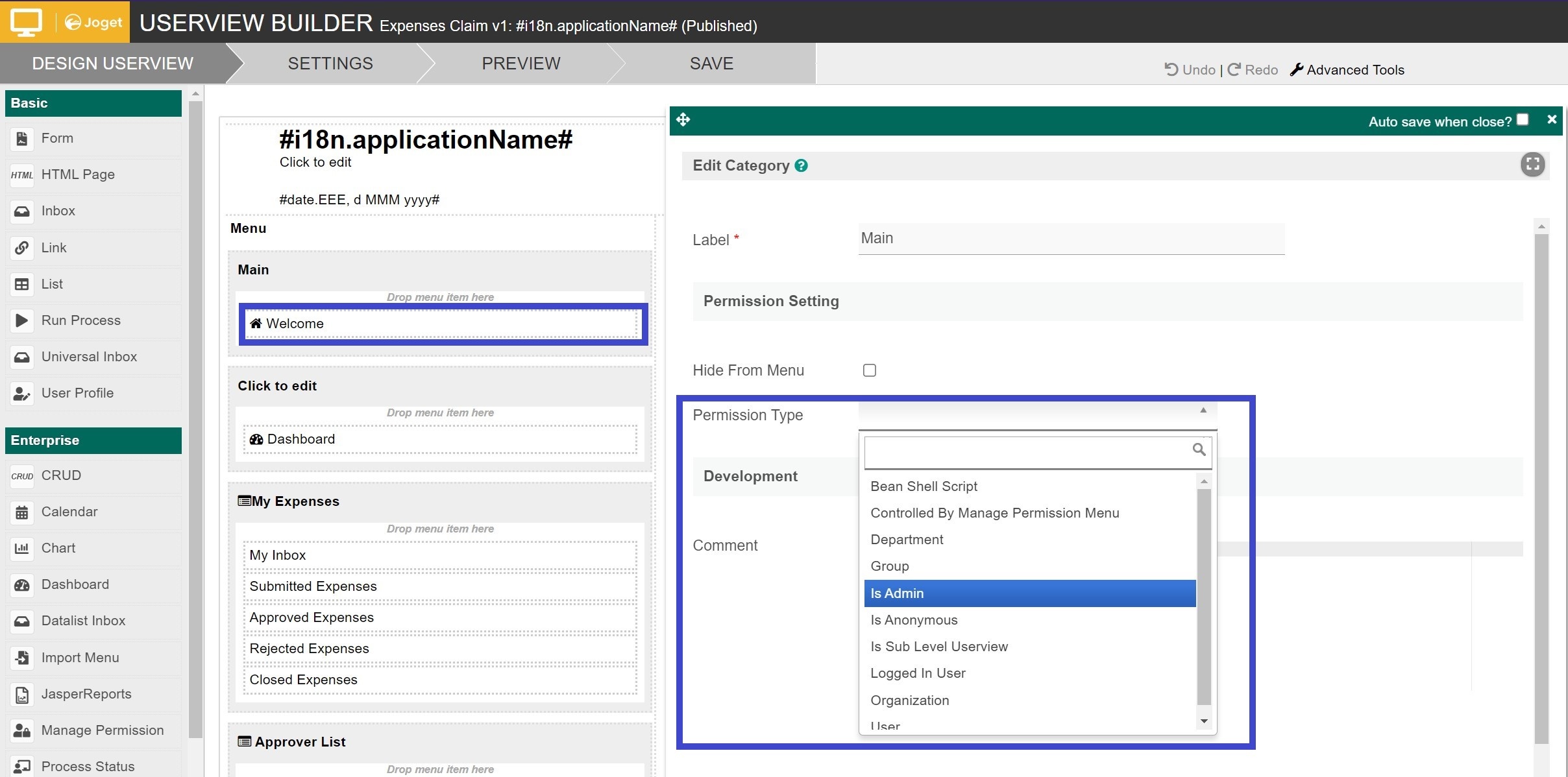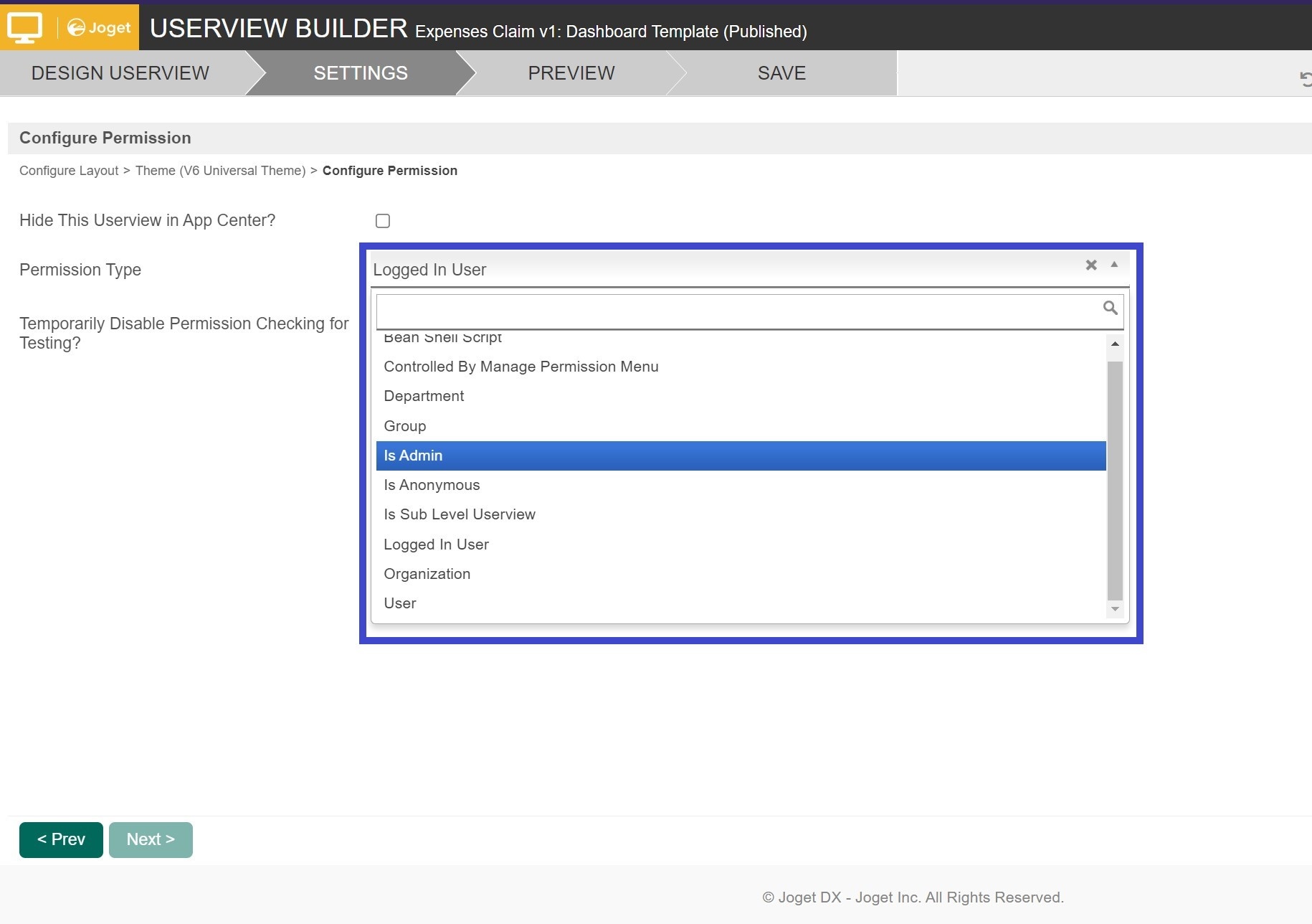 Figure 2: Screenshot showing Permission Type configuration in Userview Builder for Userview