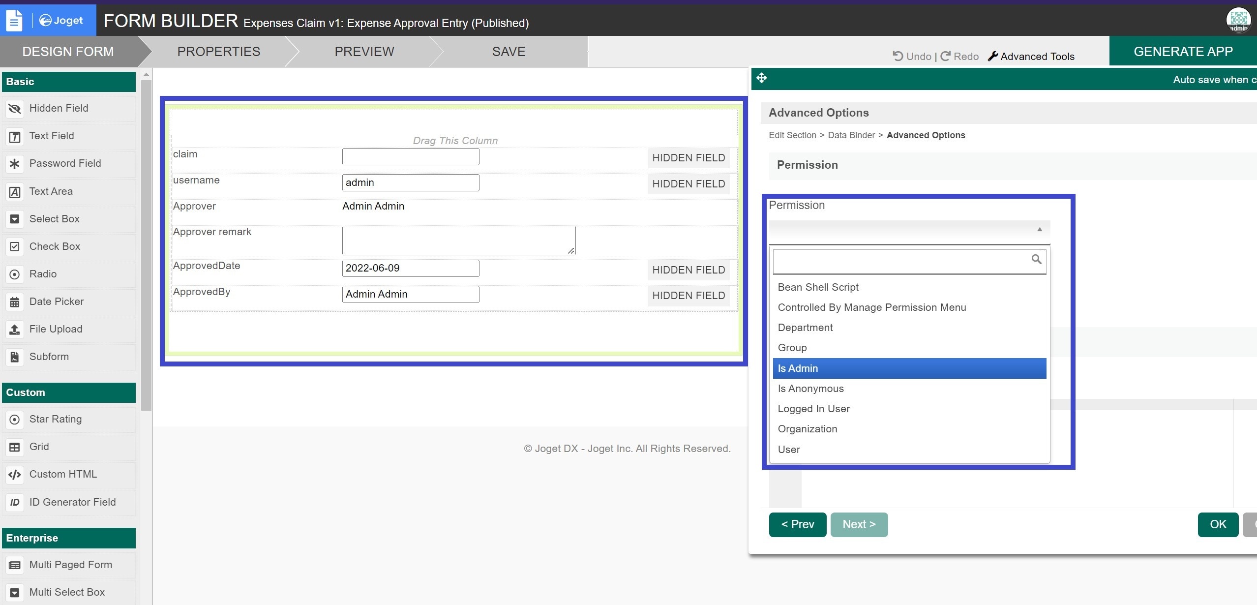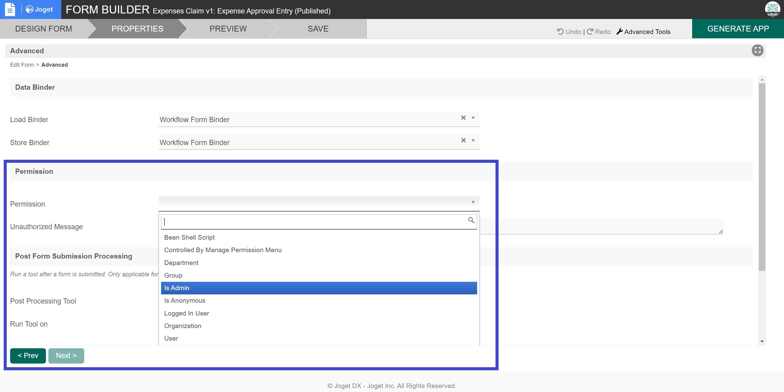 Figure 4: Screenshot showing Permission Type configuration in Form Builder for Form