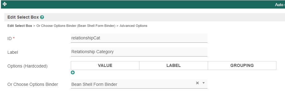Under the 'Choose Options Binder' menu, click on 'Bean Shell Form Binder' in the Options Binder select field.