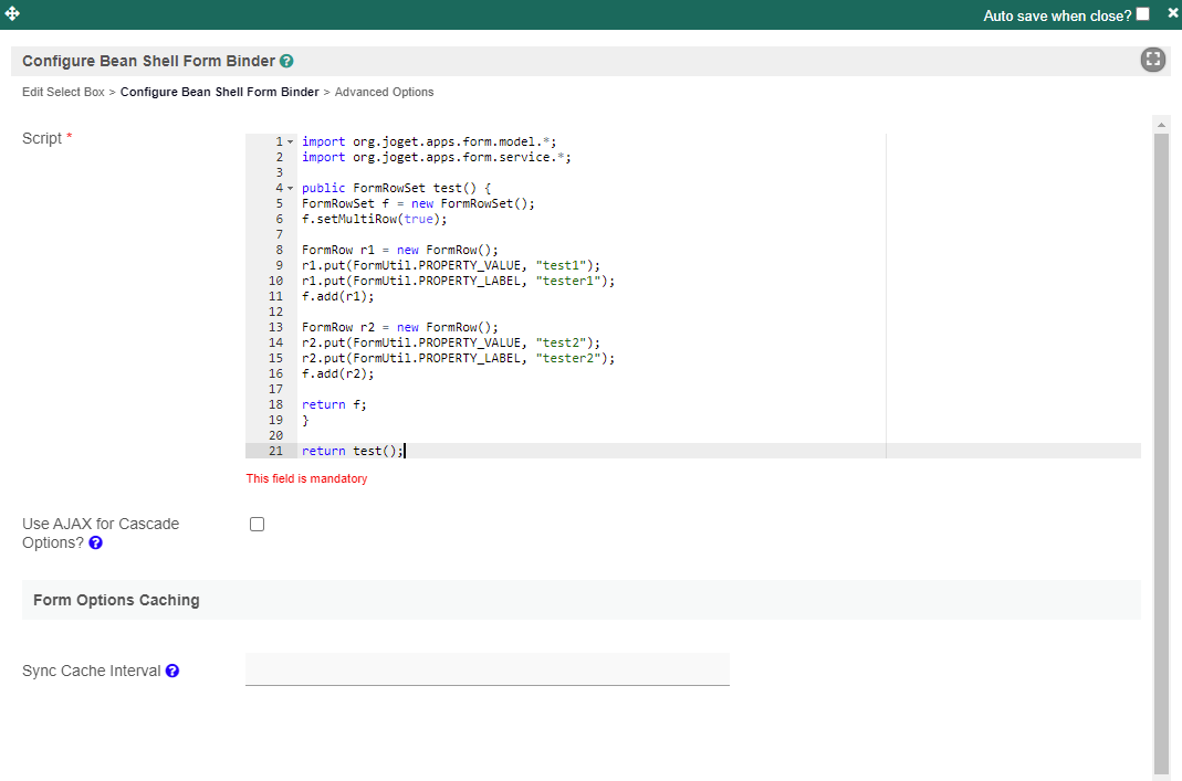 Under 'Configure Bean Shell Form Binder', enter your Bean shell script to populate the select fields. For each row that you add to the FormRowSet, be sure to put the 'FormUtil.PROPERTY_VALUE' and 'FormUtil.PROPERTY_LABEL' fields in the FormRow that will be added to the FormRowSet.