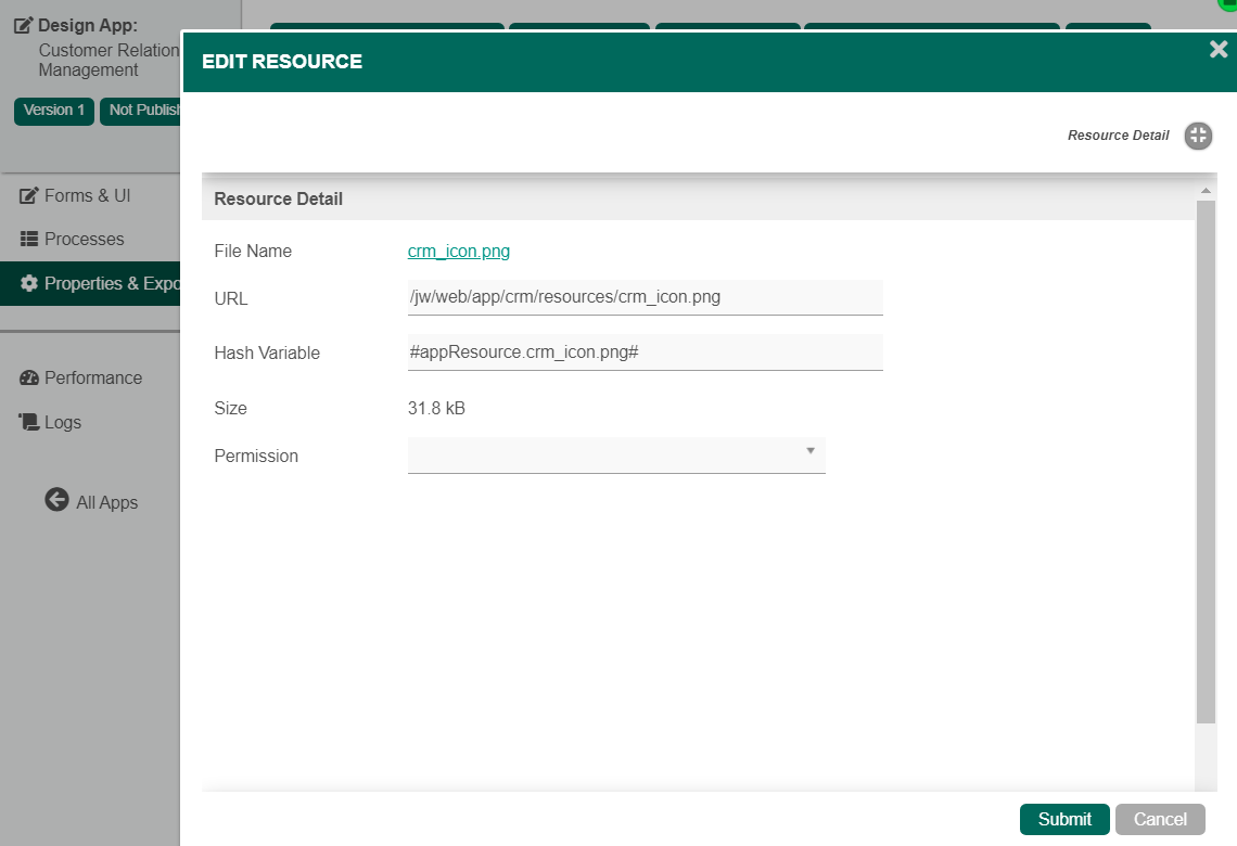 Edit Resource allows you to manage the individual resource file. You may obtain the relative URL to access the file or make use of the hash variable given within the scope of the App for convenience. The hash variable would resolve into a relative URL same as the "URL" given.