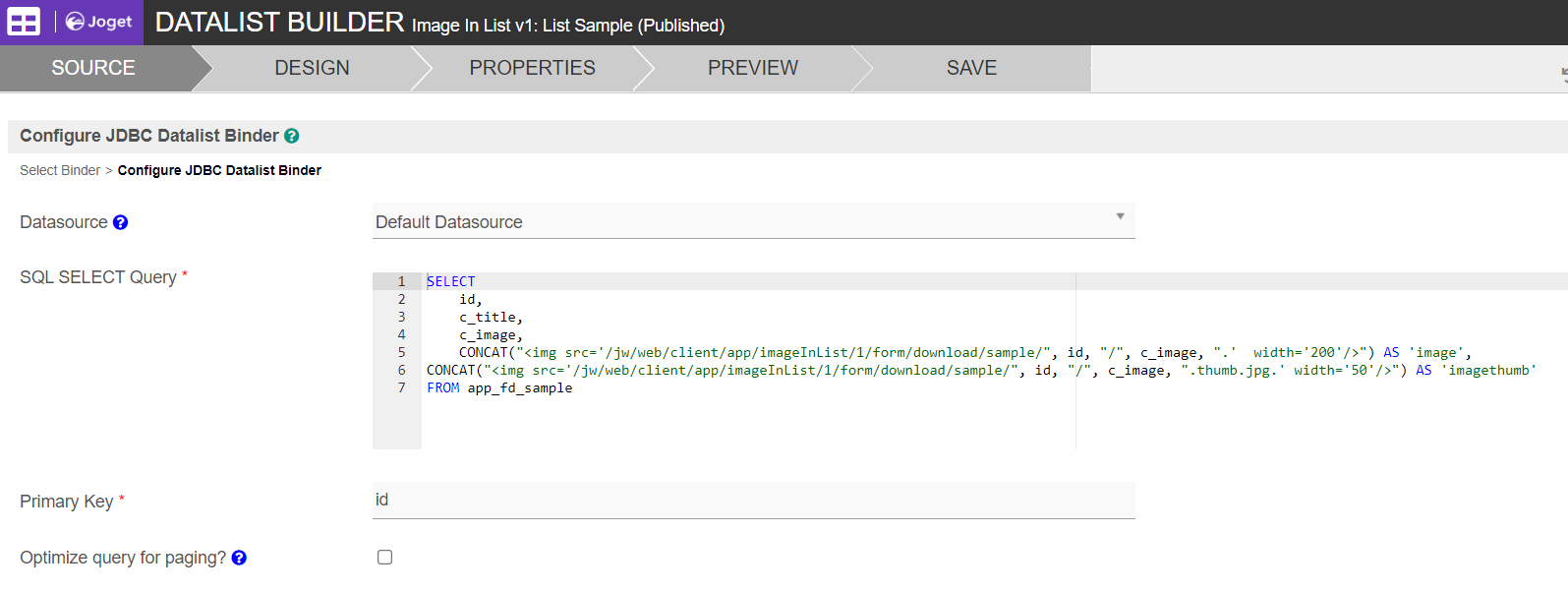 Then, in the Datalist, we will need to construct the img html tag, mimicking the image URL path. In this case, we are using the default database and writing the SQL based on MySQL database.