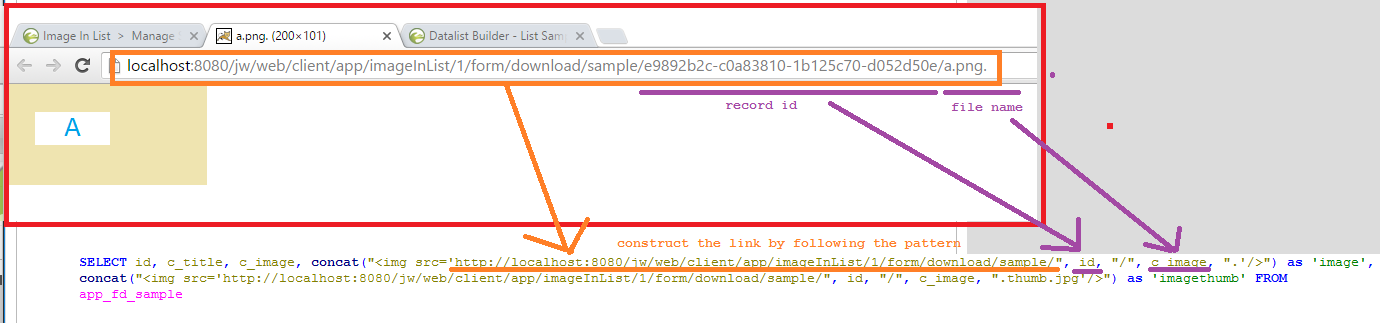 SELECT id, c_title, c_image, concat("<img src='/jw/web/client/app/imageInList/1/form/download/sample/", id, "/", c_image, ".'/>") as 'image', concat("<img src='/jw/web/client/app/imageInList/1/form/download/sample/", id, "/", c_image, ".thumb.jpg'/>") as 'imagethumb' FROM app_fd_sample
