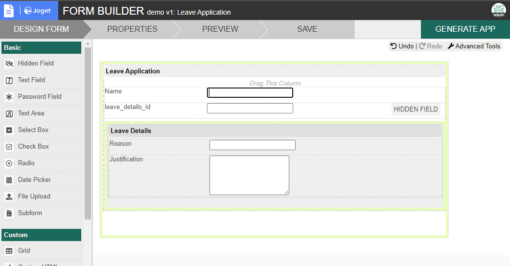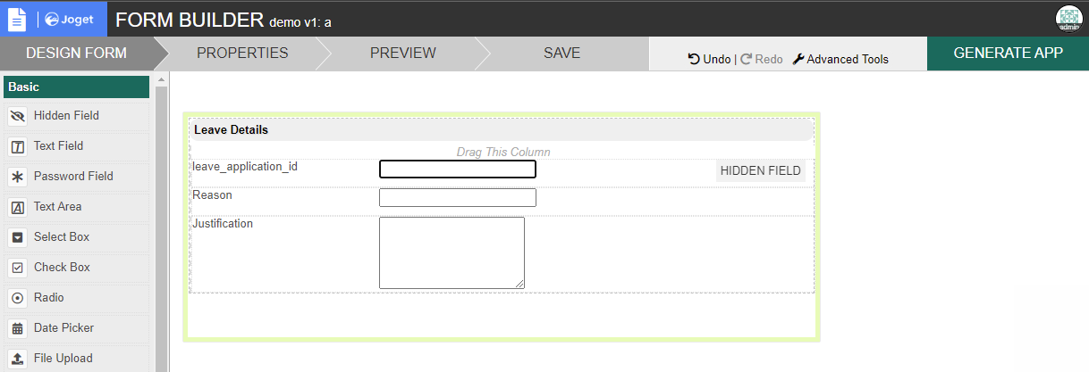 First, you will need to create a child form or the form that you would want to embed in your parent form. In the child form, add a field that will be used to store the ID of the parent form. In this example, we added the field leave_application_id.