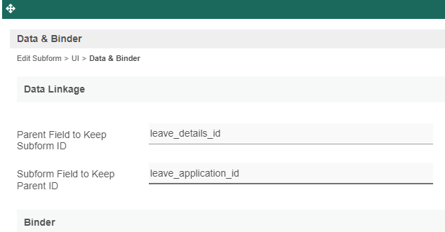 "Parent Field to keep Subform ID" can be set so that the parent form has a reference to the child record.Sample dataTable: leave_application