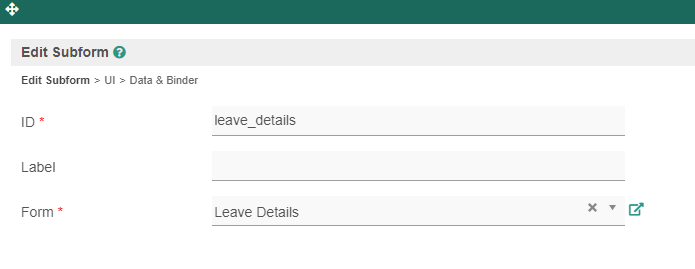 In the parent form, you can (optionally) add a field that will be used to store the ID of the child form. In this example, the field leave_details_id has been added. This is only needed in situations where there is a one-to-one relationship between the parent form and the child form. You can then embed your child form in the parent form by dragging the Sub Form form element into the section that you want the subform to appear in.
