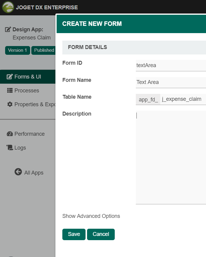 The easiest way to see how the Text Area button works is to use the existing built-in App Expenses Claims. Here are the steps: