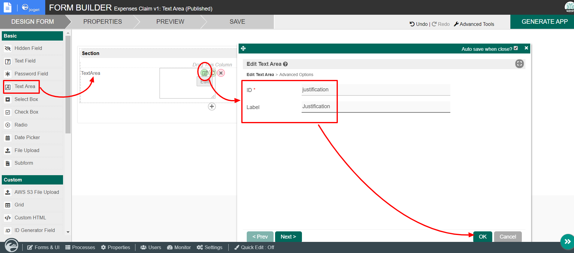 Figure 2 - Drag and drop a Text Area element on to the canvas.