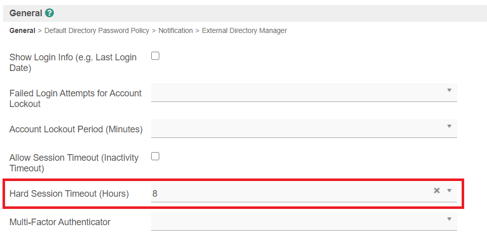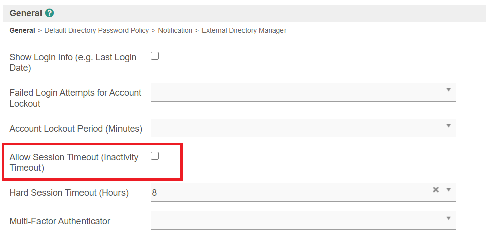 1. If the Allow Session Timeout (Inactivity Timeout) is unchecked, then the behavior is similar to the default Directory Manager.