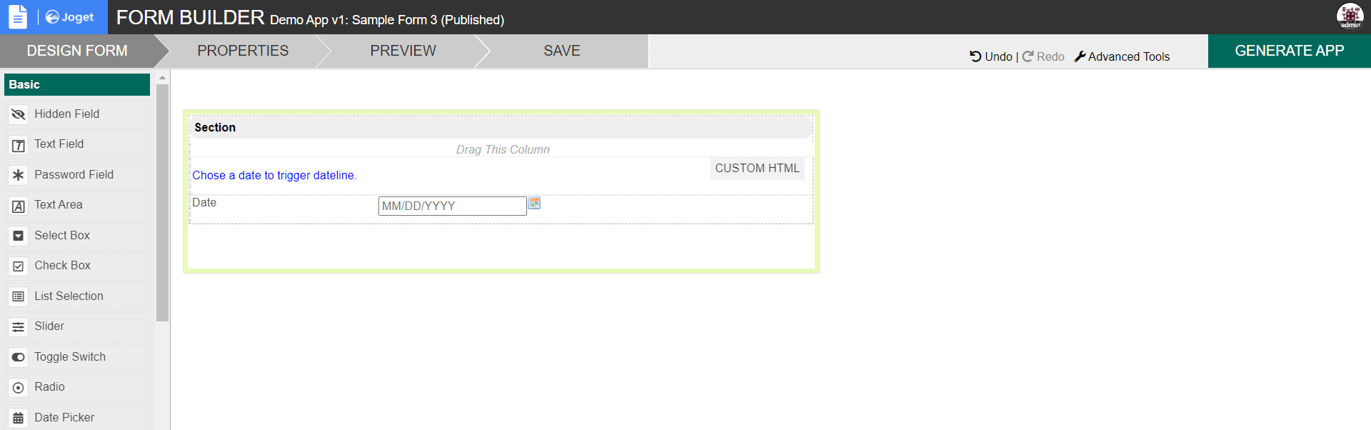 Figure 5:  Create a Form with a Date Picker element to set a date value to workflow variable.
