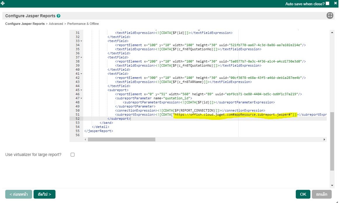 How can I call subform from TIBCO Jaspersoft in my project. I try to run it, I add 'subreport.jasper' file in Resource menu. Then, I call '#appResource.subreport.jasper#' fail, it show 'net.sf.jasperreports.engine.JRException: Error opening input stream from URL: https://offish.cloud.joget.com/jw/web/app/finance/resources/