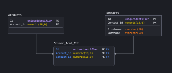 Yes I know, but in a many to many relationship the account ID column as FK is in the Joiner table, not the contact table. I have been able to populate the grid with the contact ID from the joiner table, but I don't know how to get Firstname and Lastname from the Contacts table.