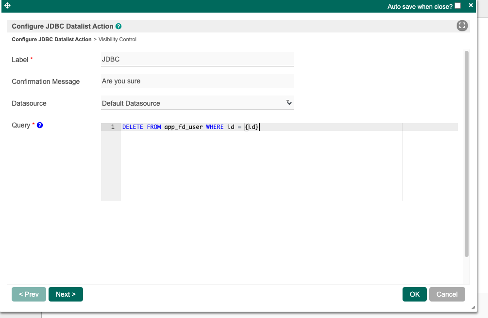 Step 2: In the JDBC query, I specified the table name as "app_fd_user". For example, the query would be: "DELETE FROM app_fd_user WHERE id = {id}".