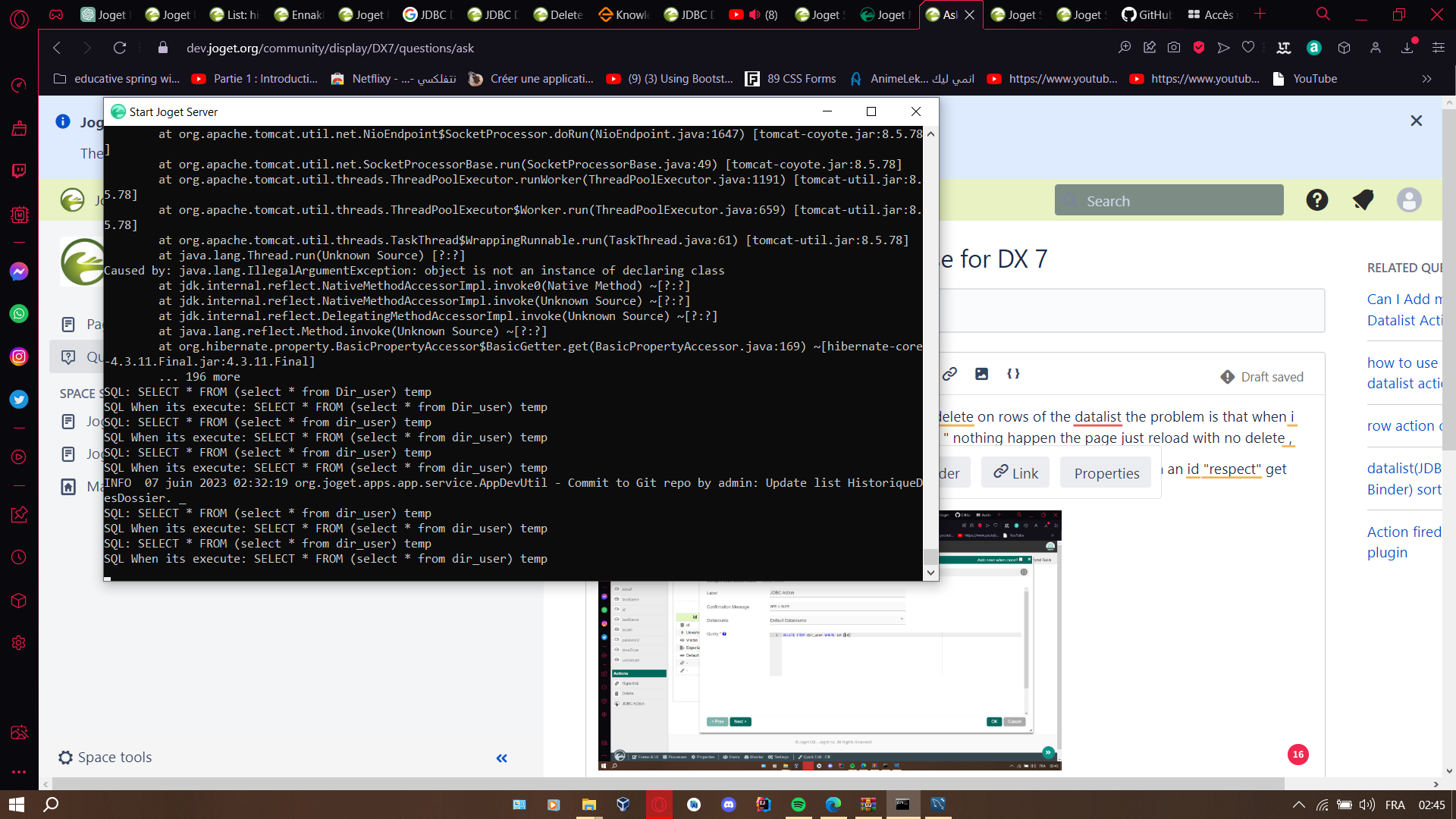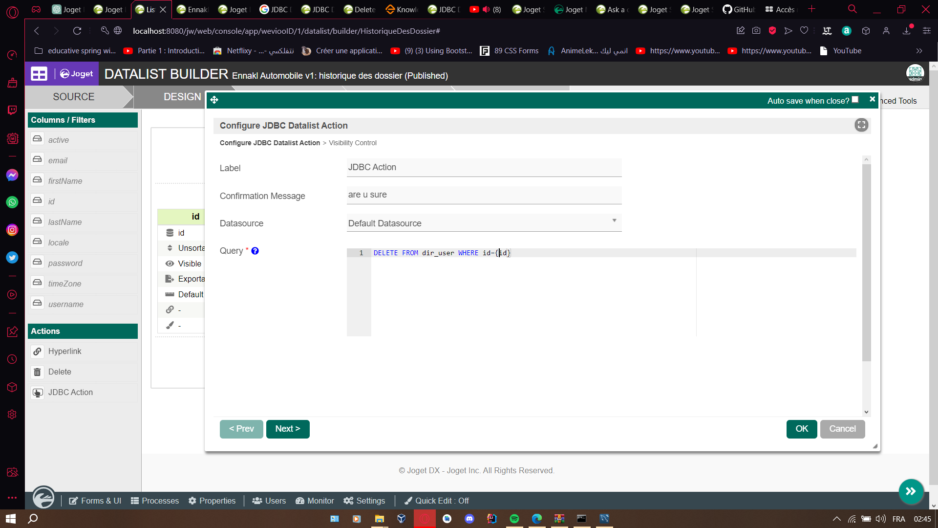 im using a jdbc action binder im trying to perform a delete on rows of the datalist the problem is that when i use this query "DELETE FROM dir_user WHERE id={id} " nothing happen the page just reload with no delete ,