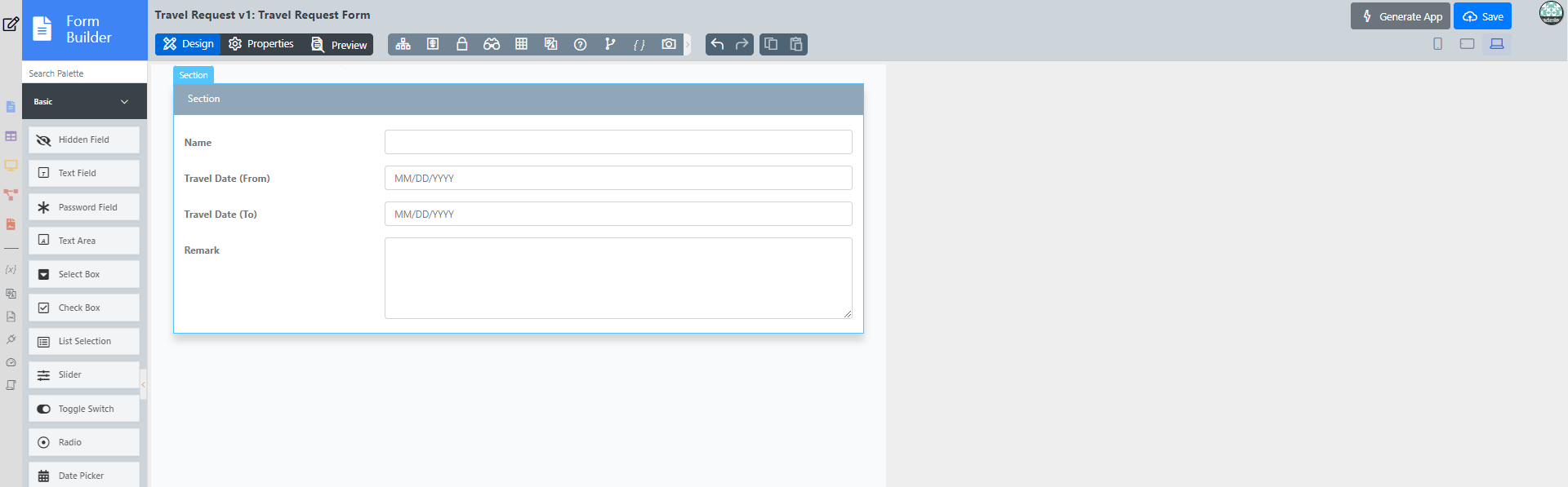 1. To use the App Generator, first create and design your form. When you are done, save the form. Then click on the large Generate App button on the top right of the Form Builder.
