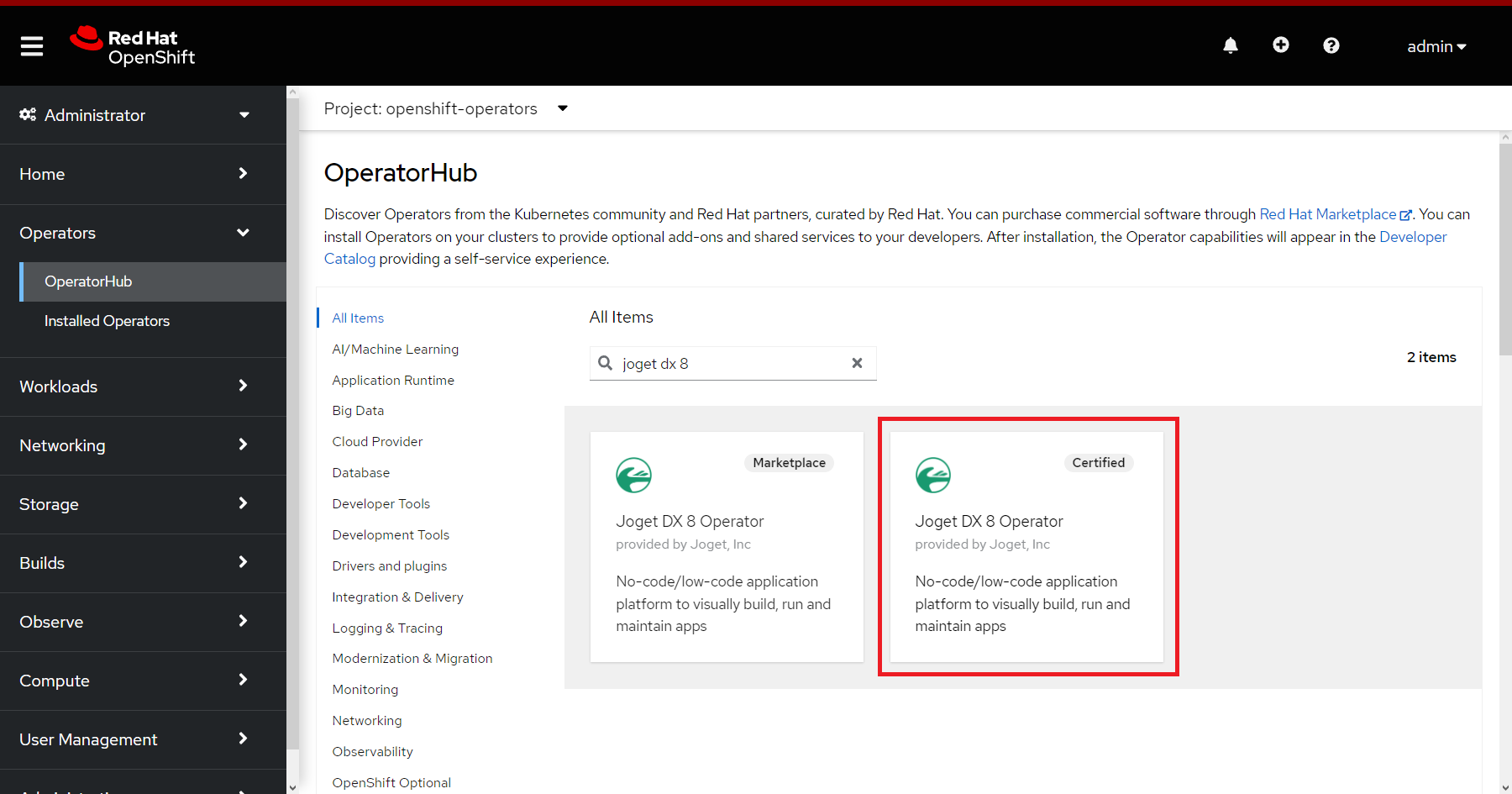 The Joget DX Operator enables customers to rapidly deploy, manage and scale a Joget DX cluster on Red Hat OpenShift. As a certified Operator, it is listed in the OpenShift Embedded OperatorHub catalog. Joget DX is a development platform as well as an application runtime, so the Joget DX Operator is listed under both the Application Runtime and Developer Tools categories.These steps assume that you already have a running OpenShift 4 cluster. You can access https://try.openshift.com/ and select Openshift 4 playground to setup a new cluster.