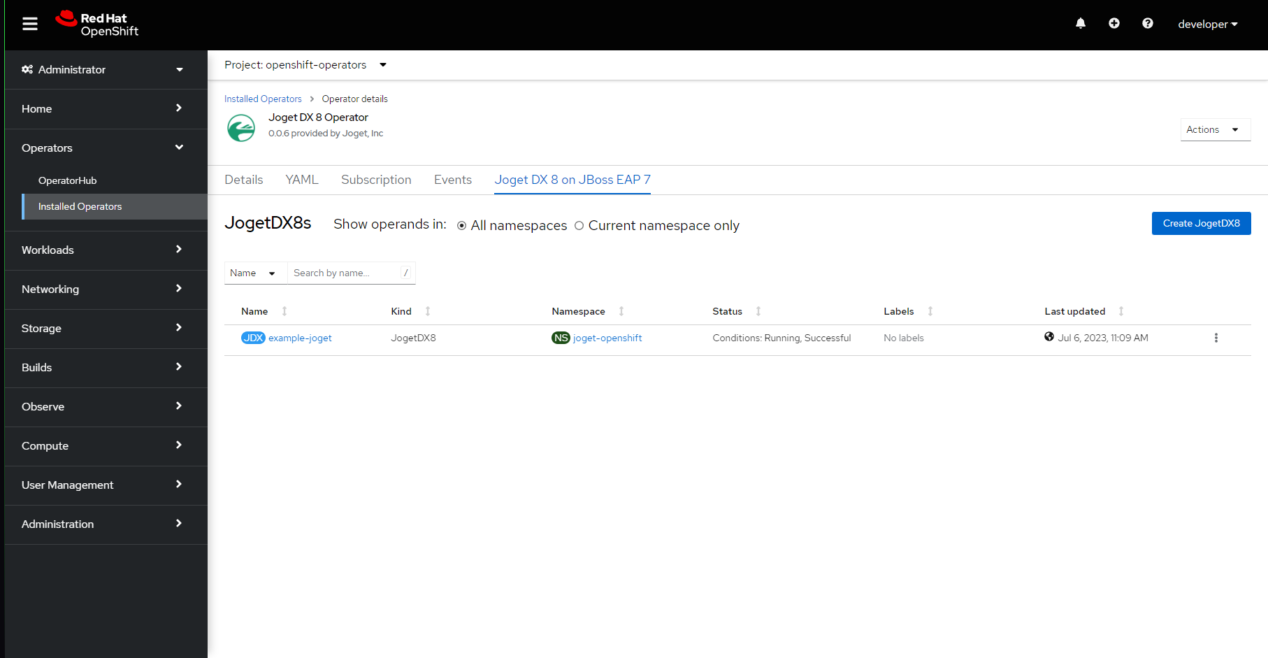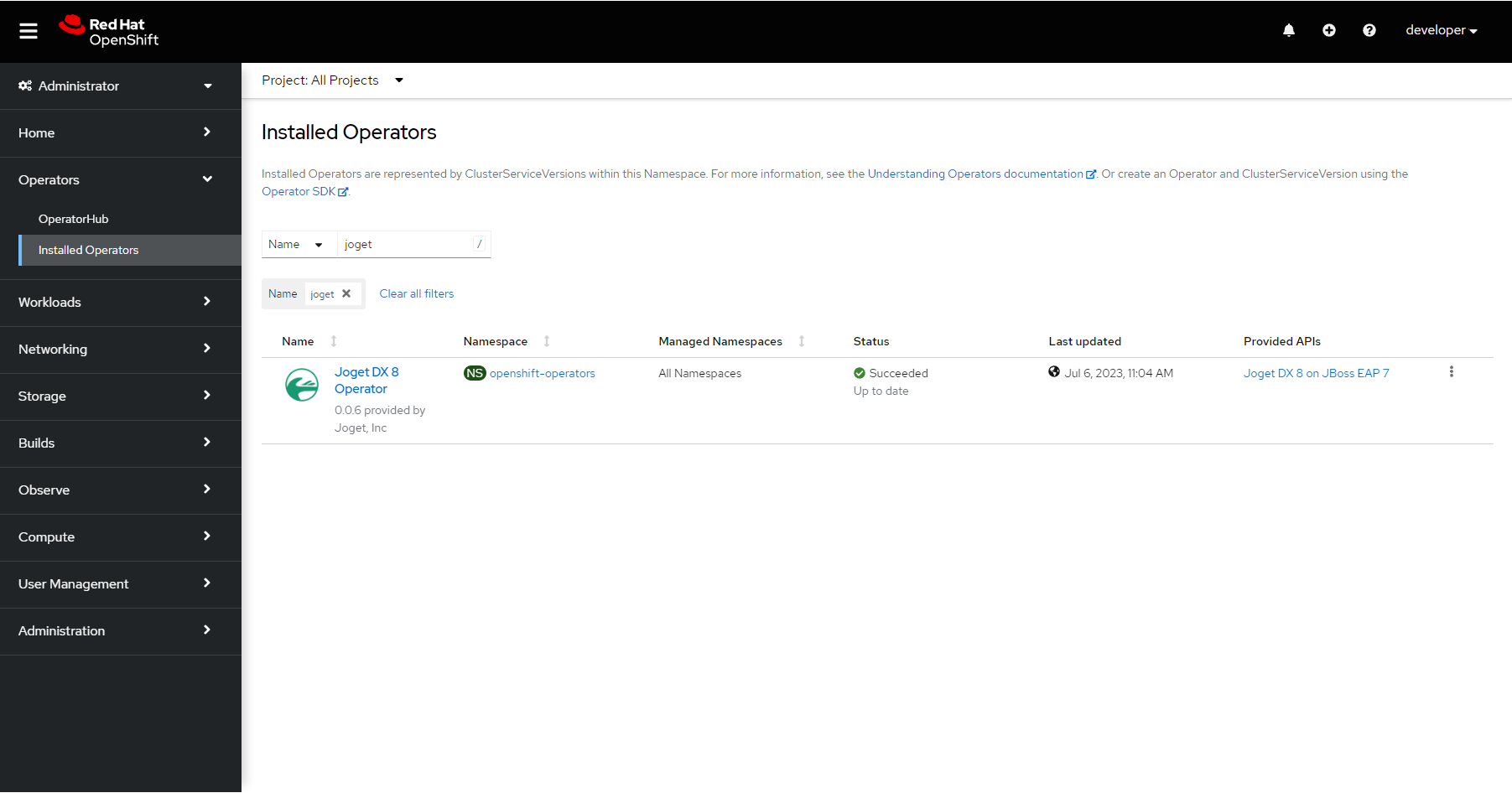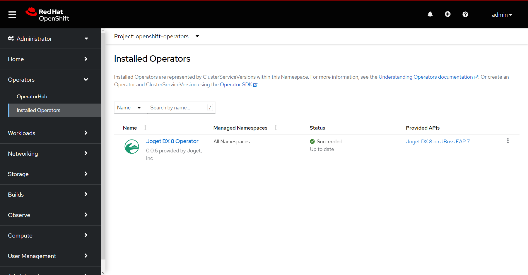 Browse to Catalog > Installed Operators and select Joget DX 8 Operator to confirm that the operator has been installed successfully.