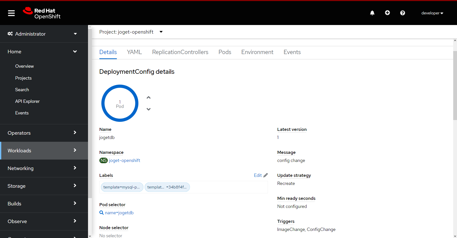 Go to Workloads → Deployment Configs to verify that the MySQL database has been deployed successfully.