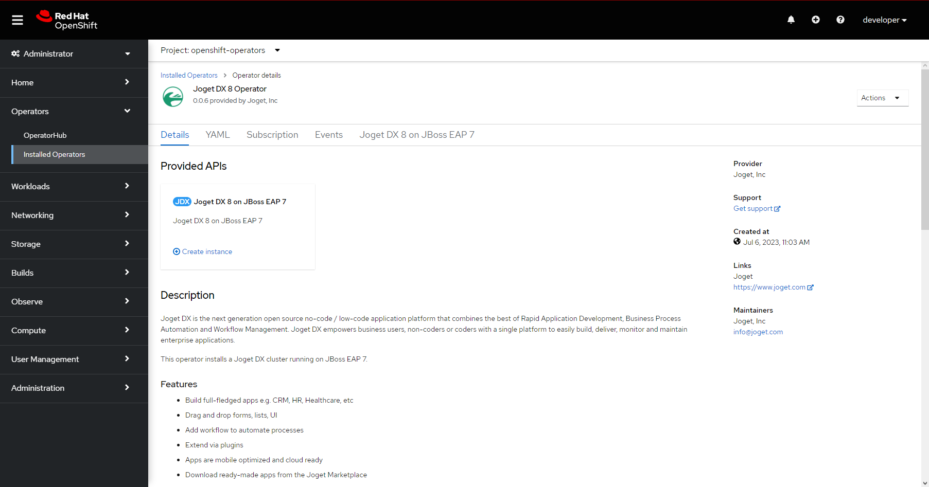 Select the Joget DX 8 Operator, and click on Create Instance.