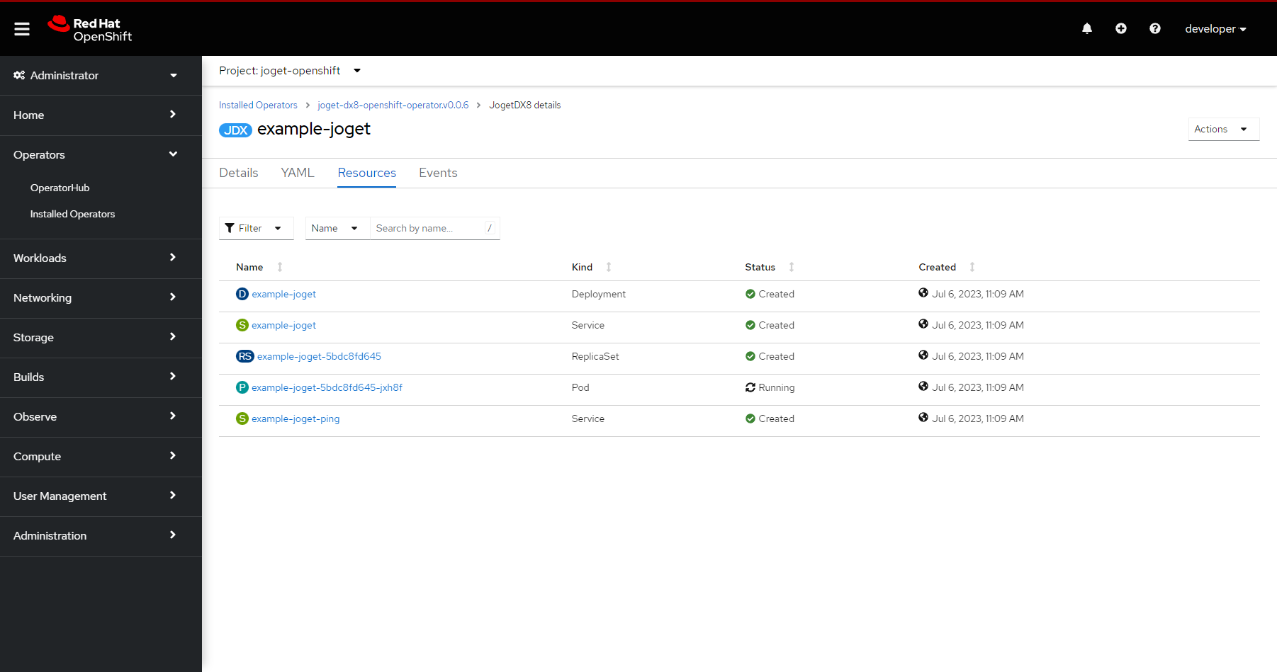 Select the created Joget name, and click on Resources to see the resources automatically created and managed by the Joget DX 8 Operator.